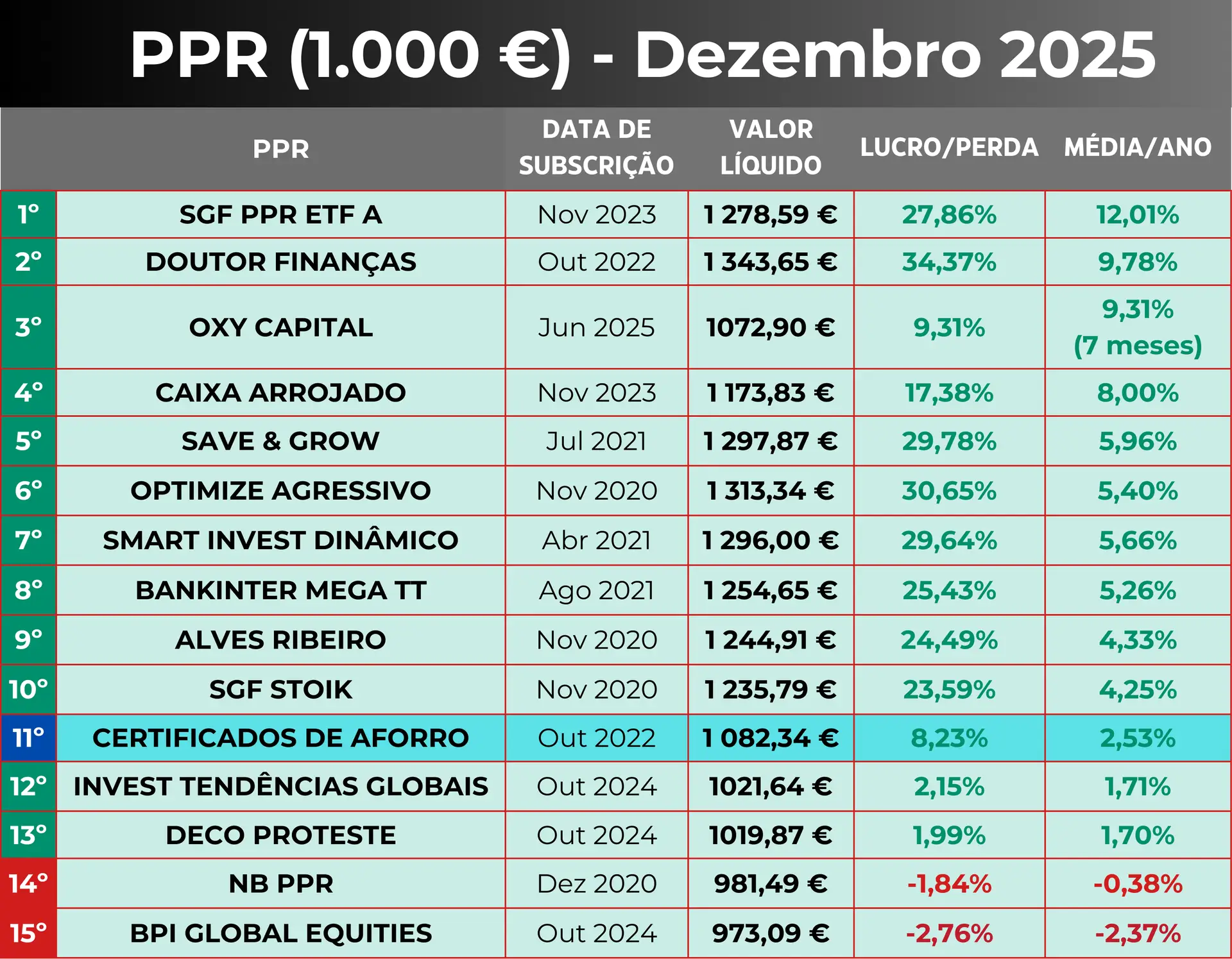 Neste gráfico acima, tem o ranking ao longo do tempo dos vários PPR. Note que o PPR Invest Tendências Globais, o PPR DECO Proteste e o BPI Global Equities são muito recentes. O Oxy Capital PPR só foi subscrito em junho de 2025. Logo, é normal estarem no fundo da tabela. Temos de lhes dar tempo. O meu critério - que é discutível - é o valor líquido que estão a render (o saldo real na conta).